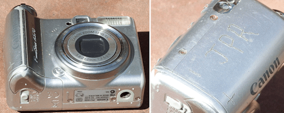 - Note: Previous owner etched initials and battery polarity into side of camera case.