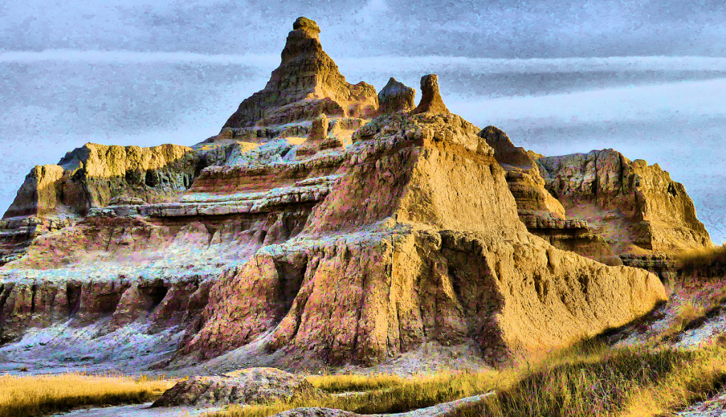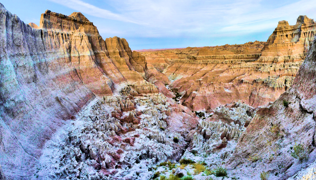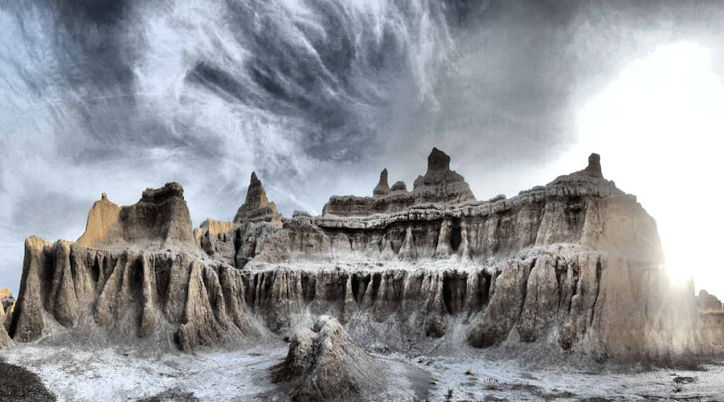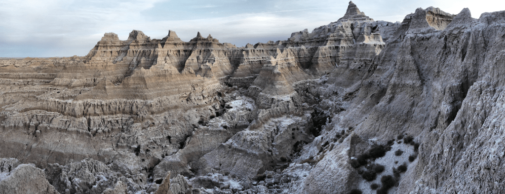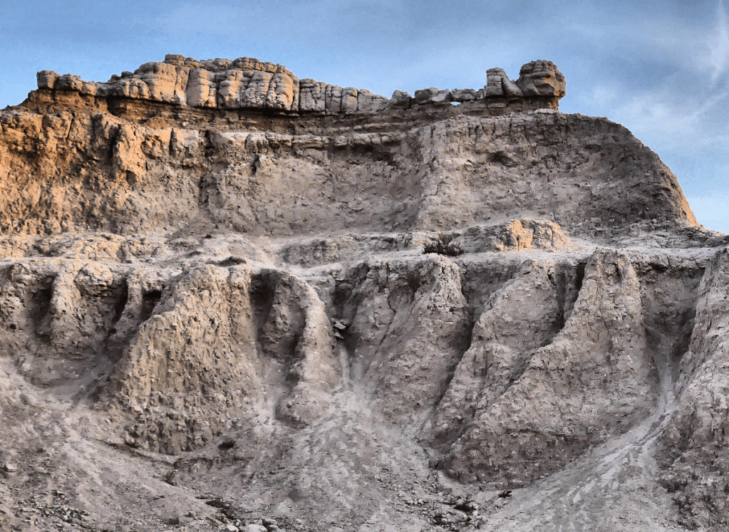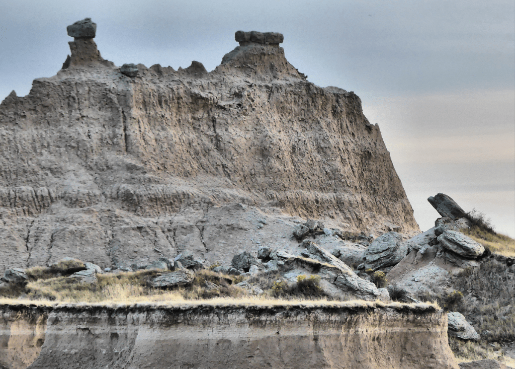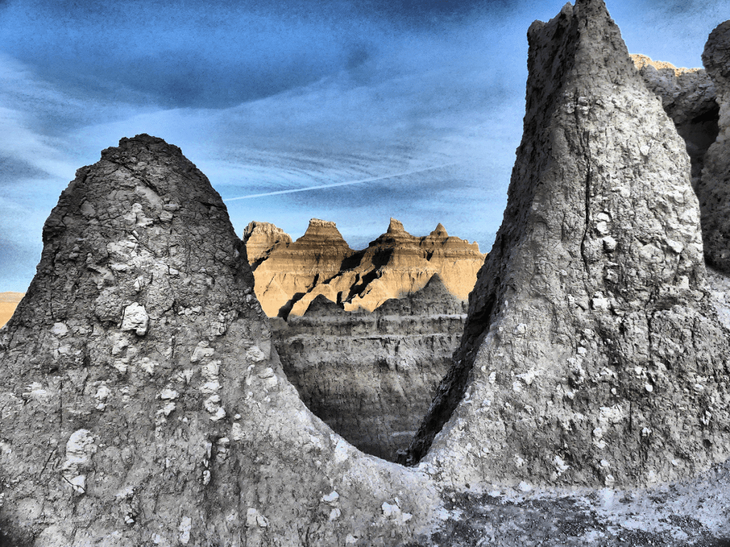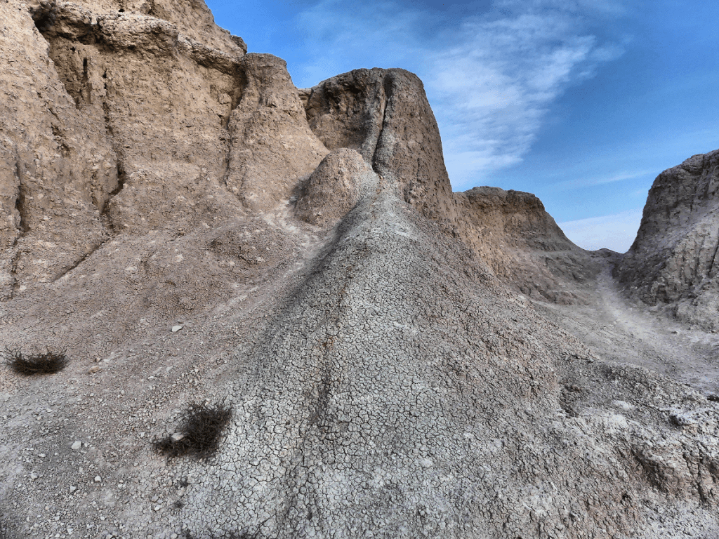 Volcanic ash from Black Hills overlying Pierre Shale.These veins throughout the park turned out to be the most interesting features.Trolls live in these caves.Can’t get over the clay-filled fractures.No smiling. This is serious geology.Arroyo behind our campsite.My favorite pic (so far).Note the thin soil profile. The quarter-section (“starvation claims”) farmers soon found out that it takes at least 1,000 acres to feed the family.
