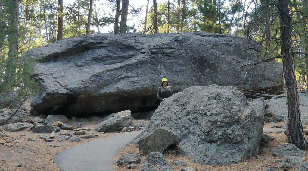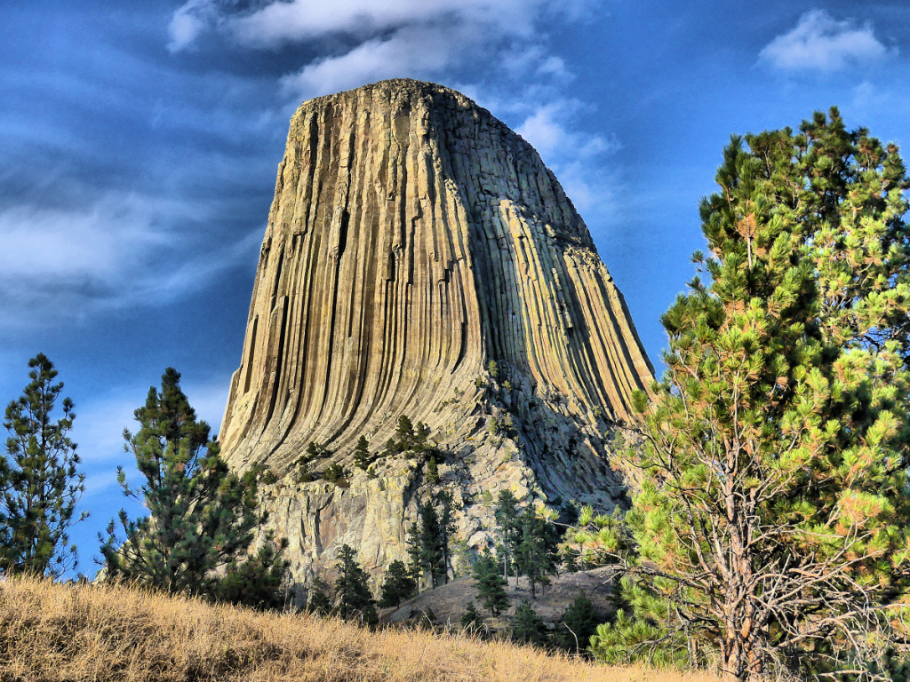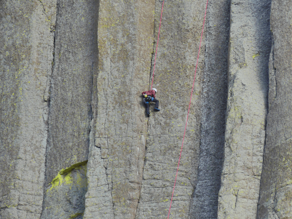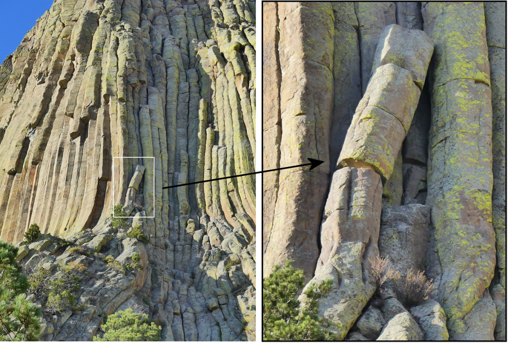 Rising from the plains. Is it a feeder for an overlying volcano, an overlying laccolith, or just a stock?The rock is a porphyritic phonolite (extrusive nepheline syenite). Methinks the viscosity leans towards the stock theory.The phonolite cooled into hexagonal columns that beak off and form a rubble pile at the base of the tower.Broken-off columns. There are some old roads in Europe that are paved with smaller basalt column hexagons.Here’s a column chunk that broke off and almost crushed Dyan (had she been sanding there whenever it actually fell off).The tower is a Mecca for climbers.This fox was unsuccessfully stalking the prairie dogs.Our cabin provided an unobstructed view of the tower. The campsite set up a viewing of Close Encounters with the tower looming up behind the screen.Goodbye Mister Devil and all of the other wonders that we saw during our 3,700 mile / 16-day excursion.