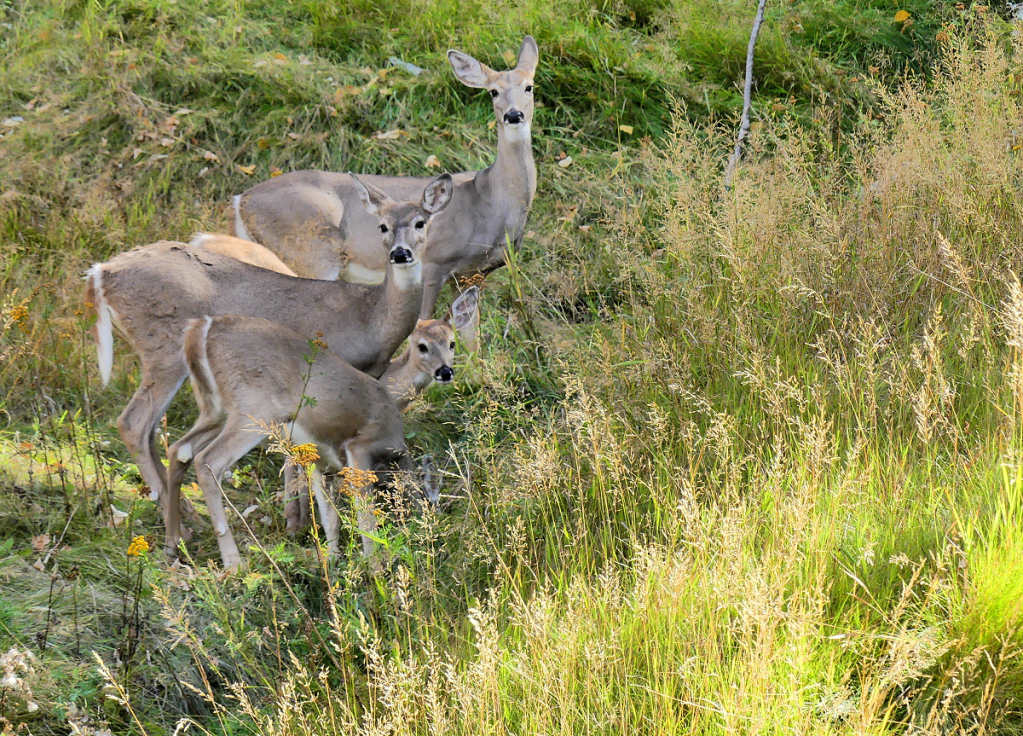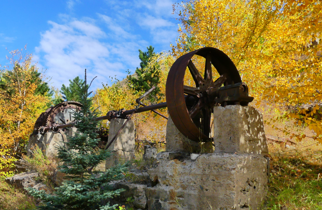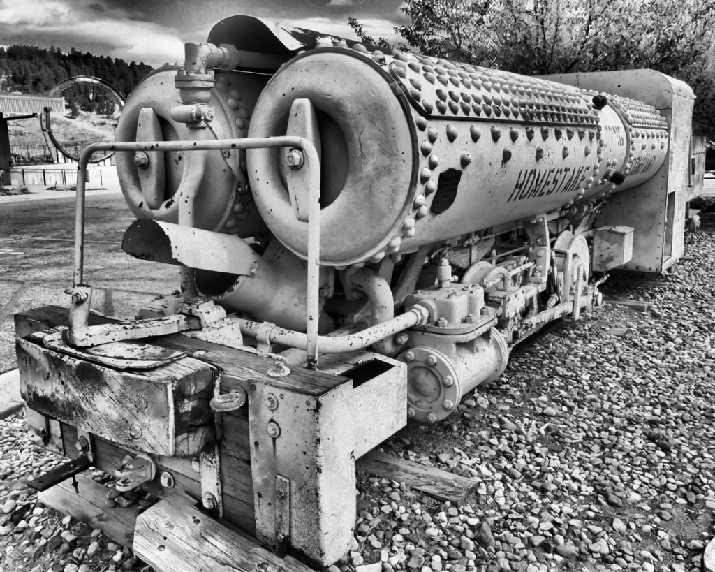 Fall colors from an hill in Deadwood.Bambi, Bambone, Bamber, and Bambam.Campsite in Deadwood. We didn’t camp here. Next time.Remnants of ball crusher at campsite. Circa 1940’s.Large hole in ground in Lead, SD. Main veins are kinda conspicuous.Air locomotive.Sexy lift operator.3D model of mine workings.Barrick donated the Homestake (and associated liabilities) to NSF. It’s now used as a super-deep (8,100′) laboratory for detecting neutrinos and other cosmic debris.Siblings Dyan & Clyde reunite within the circle of love. Actually, it’s a bracket for holding a decommissioned neutrino detector tank. Imaging hauling this equipment up and down the mine.