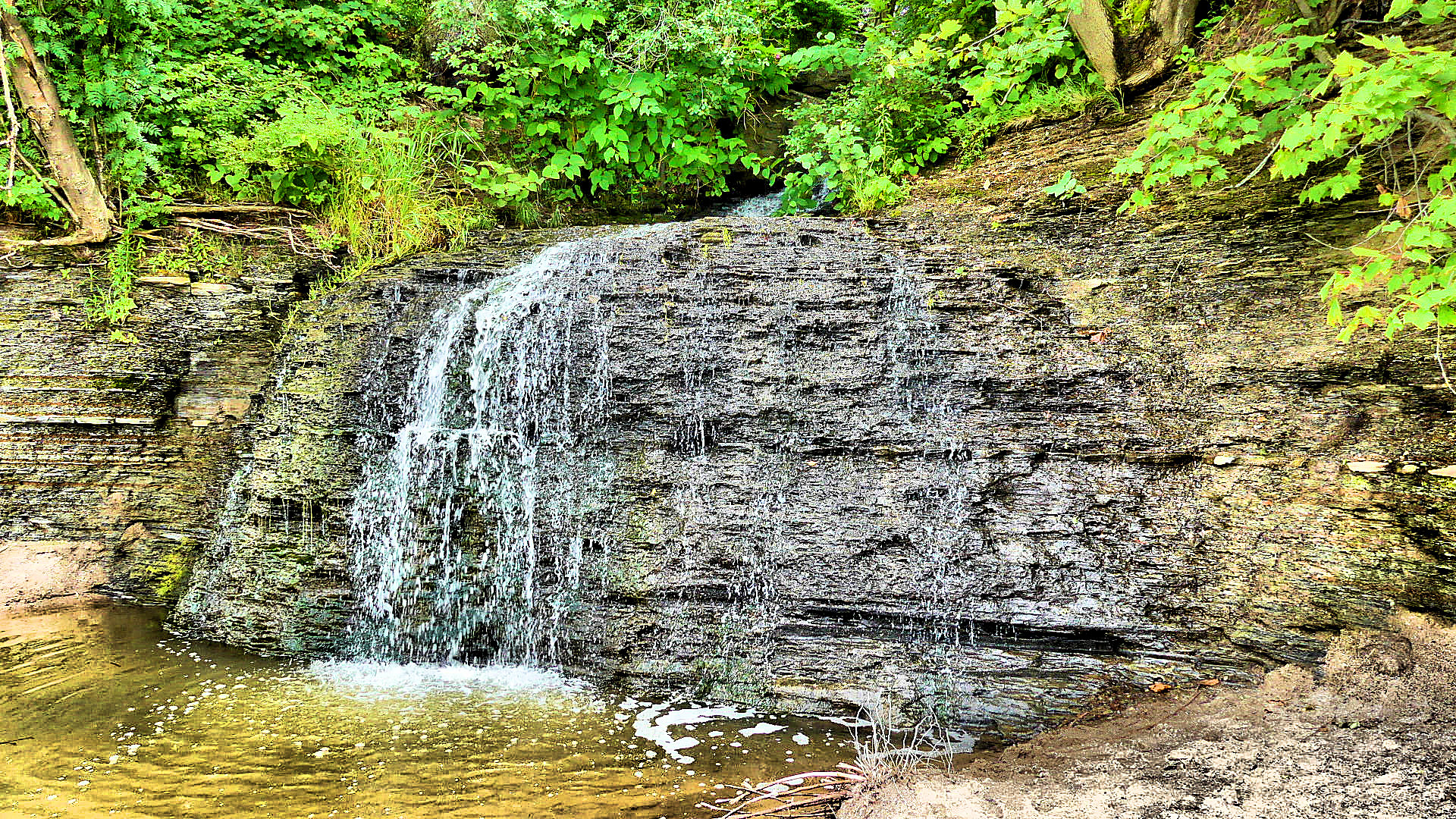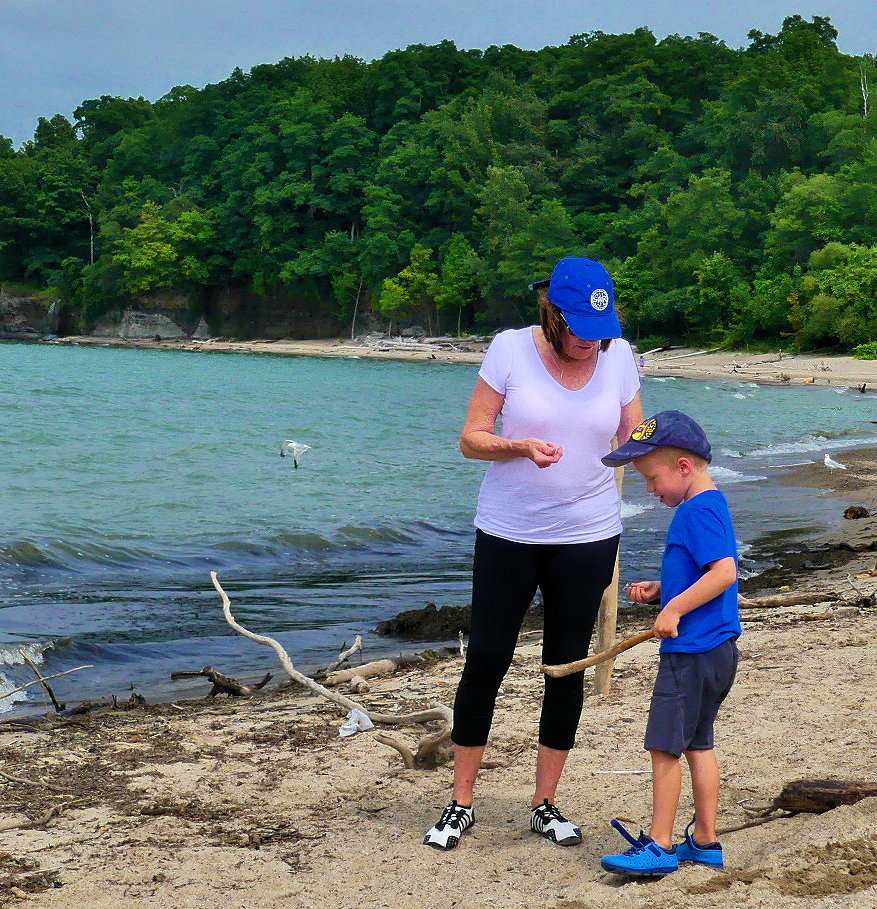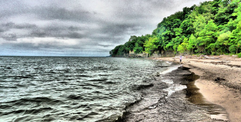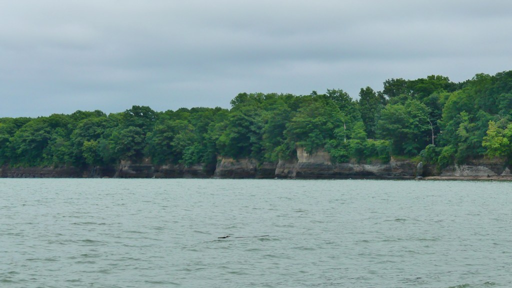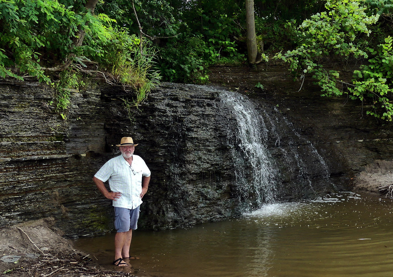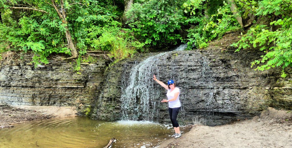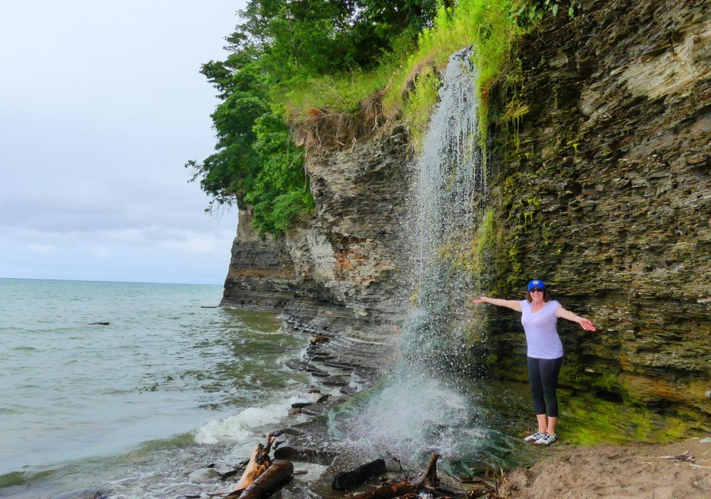 Lake Erie coastline – Pike Shale.Lake ErieWaterfall over Pike ShalePike Shale closeup.Another waterfall over Pike Shale.VannaScale ObjectSandstone ledges within Pike Shale.Colorful fish resting on beach.Ugly vulture eyeballing colorful fish resting on beach.Water cascading over Pike Shale in Lake Erie.Dyan preparing for shower.Dyan searching for beach glass.Dyan generously but reluctantly sharing beach glass with stick wielding ruffian.
