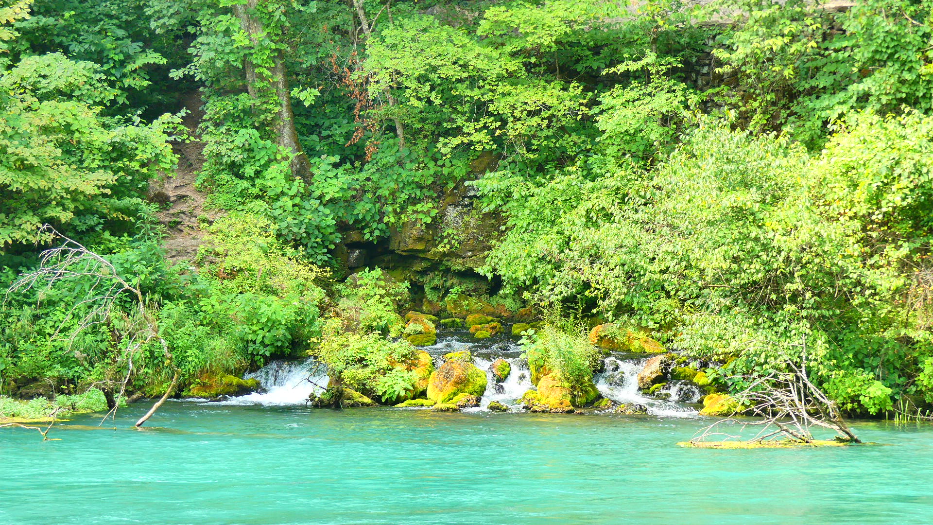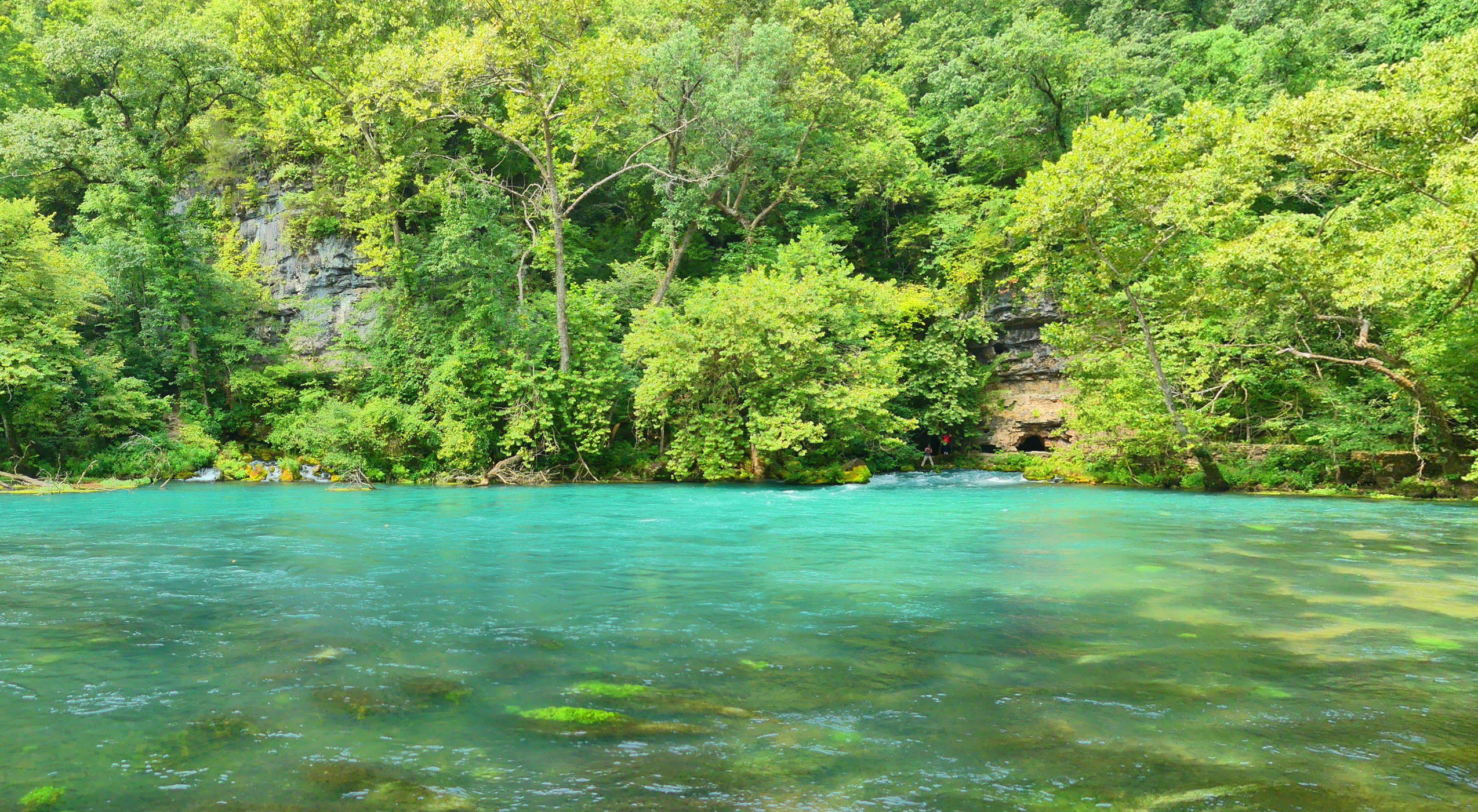 Minor gravity spring on left and mega upwelling artesian spring on right.Gravity spring. Pretty but nowhere near as much volume as the artesian spring.Overhead view of artesian spring. This puppy is one of the largest in the USA – 286 million gallons per day from a source more than 50 miles away. The dissolved dolomite in the water is estimated at 173 tons/day. This means that over the course of a year, the equivalent of a 1 mile long 11×12′ cave is being created. In other words, there must be bergillions of huge undiscovered caves in southern Missouri. Bergillions!Troglodyte cave babe.