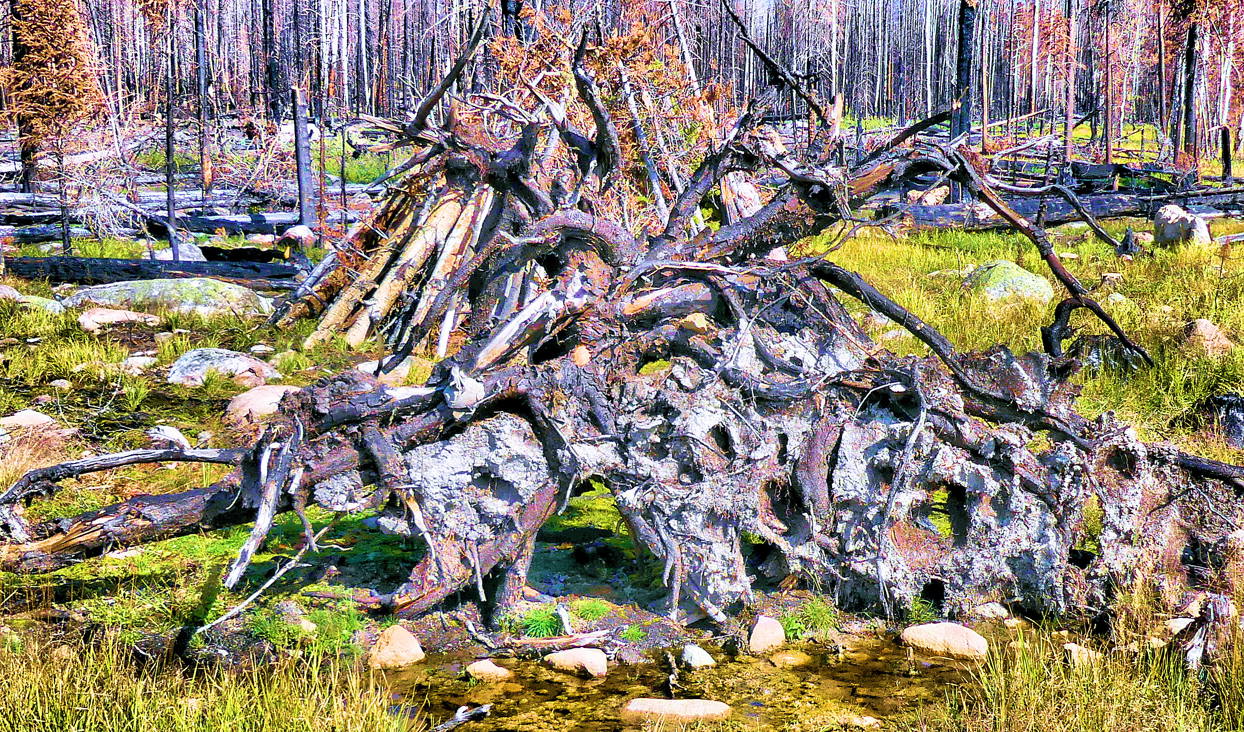 Huge gravel stockpile.Carnage caused by fires. Signs of slow recovery are evident.Root mass with ash between roots.Fine automobile at Grand Lake Lodge.Not sure if this fire truck was used during the recent fires – but I doubt it.Some sort of psychedelia in the woods.Grand LakeLarge RockWaterfall on main drainage that feeds Grand Lake. A tunnel just uphill of Grand Lake feeds water to Estes Park. Water is pumped from Lake Granby to Grand Lake during times of low meltwater.Canyon below falls.Be still my heart.Betty Grable had an influence on automotive design.View from ascent to top of Rocky Mountain National Park down valley towards Grand Lake. This is prime mouse country.View to the west.Cirque to the east of Rocky Mountain National Park HQ.Cool dudes.Blue lights under camper make it easy to find and to circumnavigate on moonless nights.Sheared metamorphics within the core complex attest to some serious mountain building.