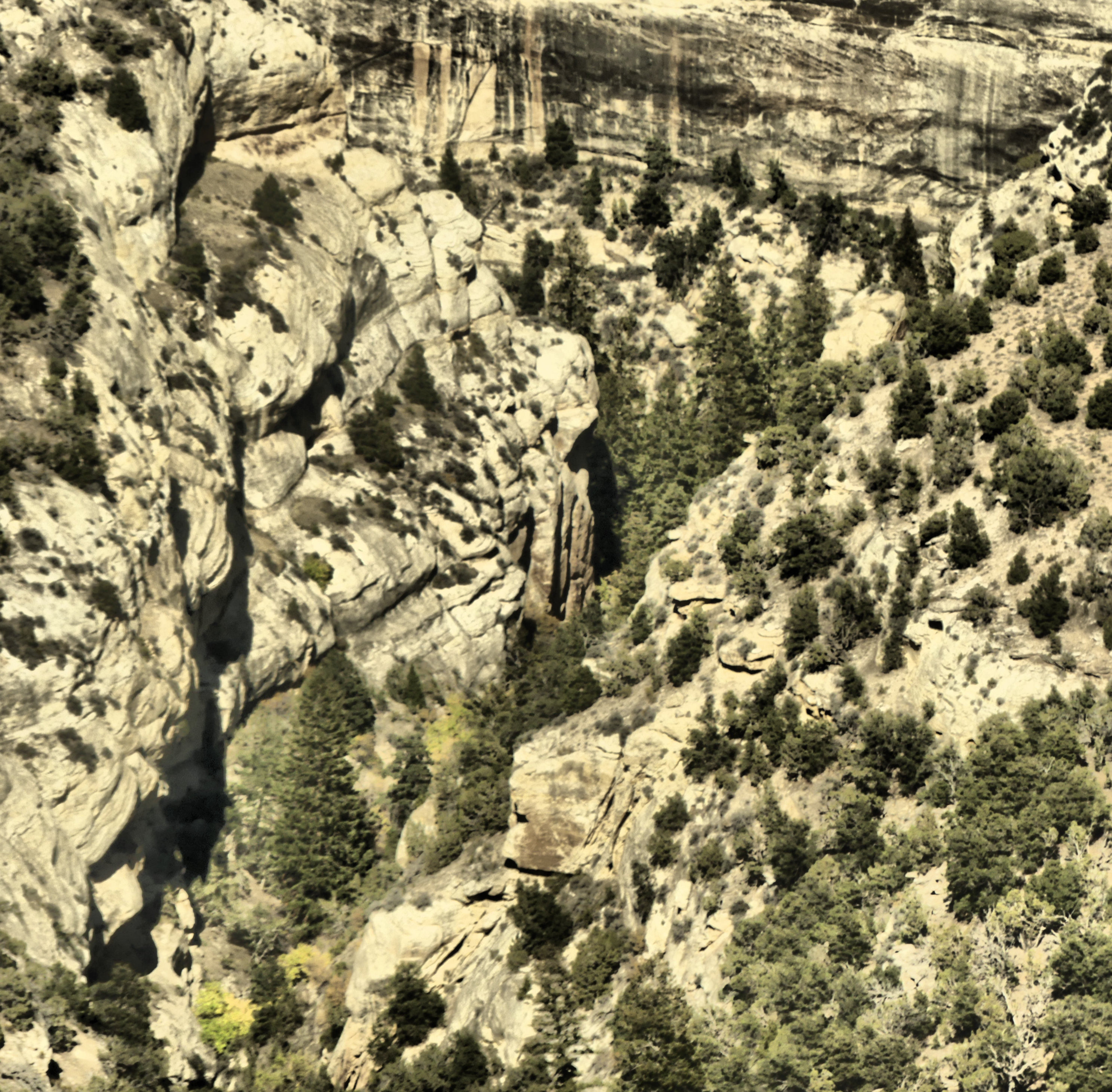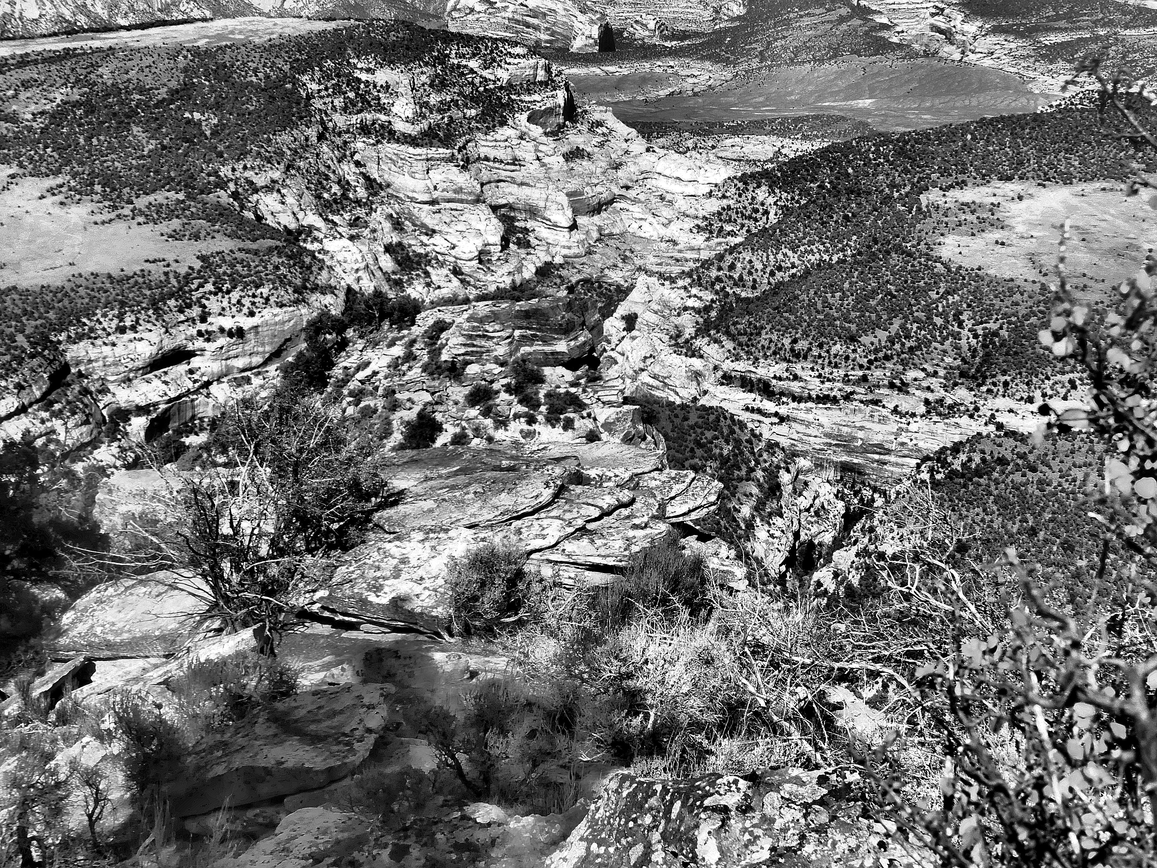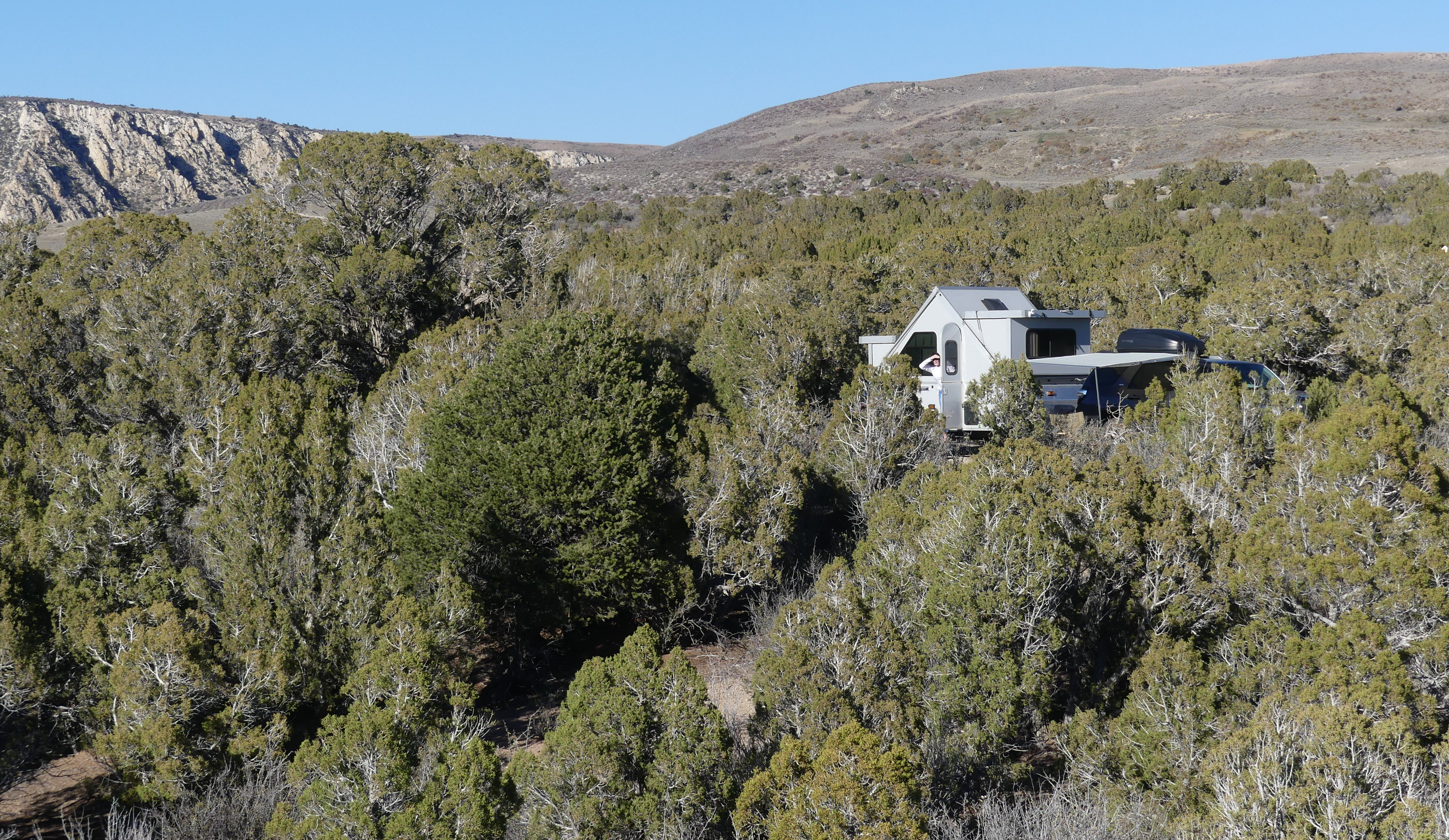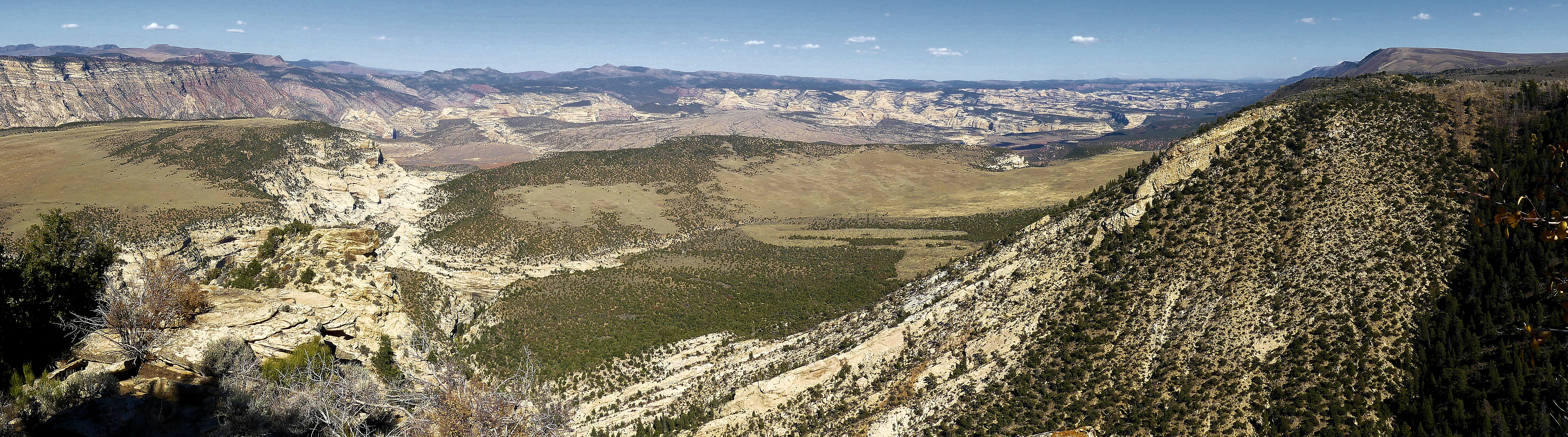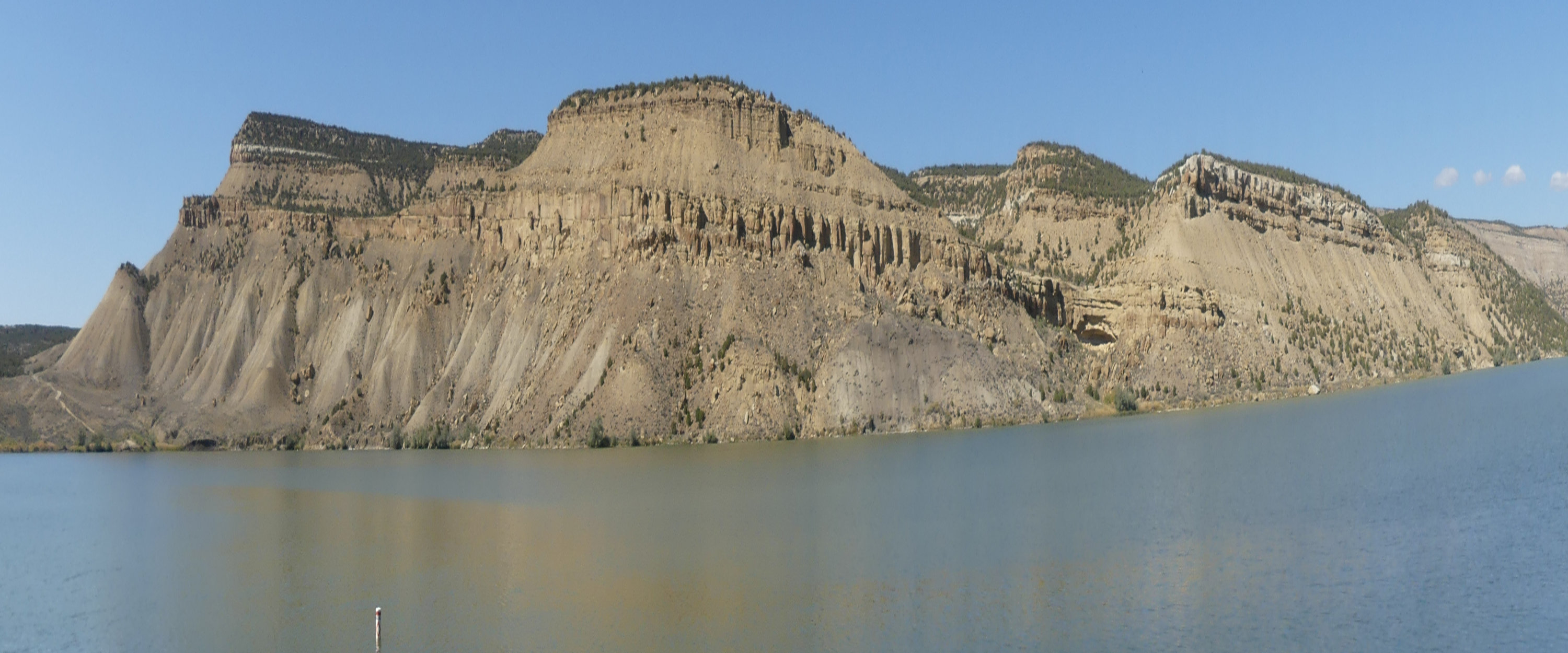 Reservoir along the route.Zooming in on a small segment of the Dinosaur National Monument Overlook.Looking down into deeply incised canyons.Oodles of structure.More incised drainage.A tripod allows us to merge pictures to include both of us.Bristlecone beast.Jawbone served as good omen on road leading to our campsite.Found a campsite on BLM land without any neighbors for miles in any direction.Nestled in a pinion forestPinion forest.Trolls.Pinion mother.Elderly pinion.View to SE of campsite.Marly sandstone.Stonefaced.